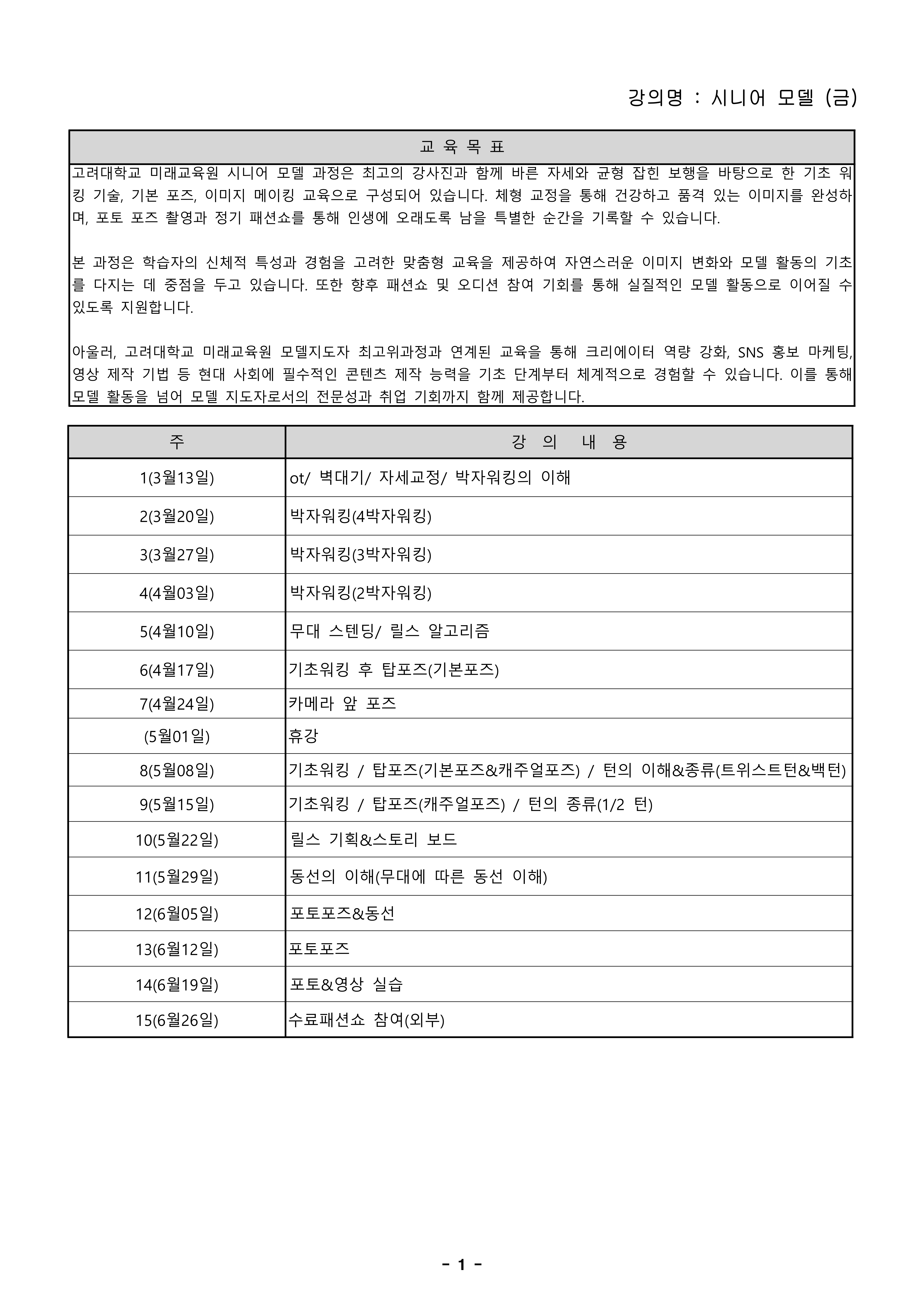 26-1 고려대학교 미래교육원 시니어모델 과정 강의계획서